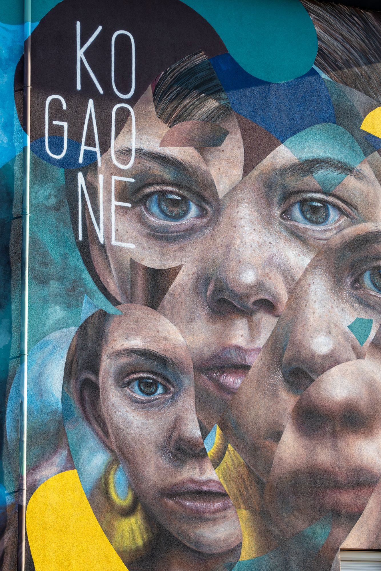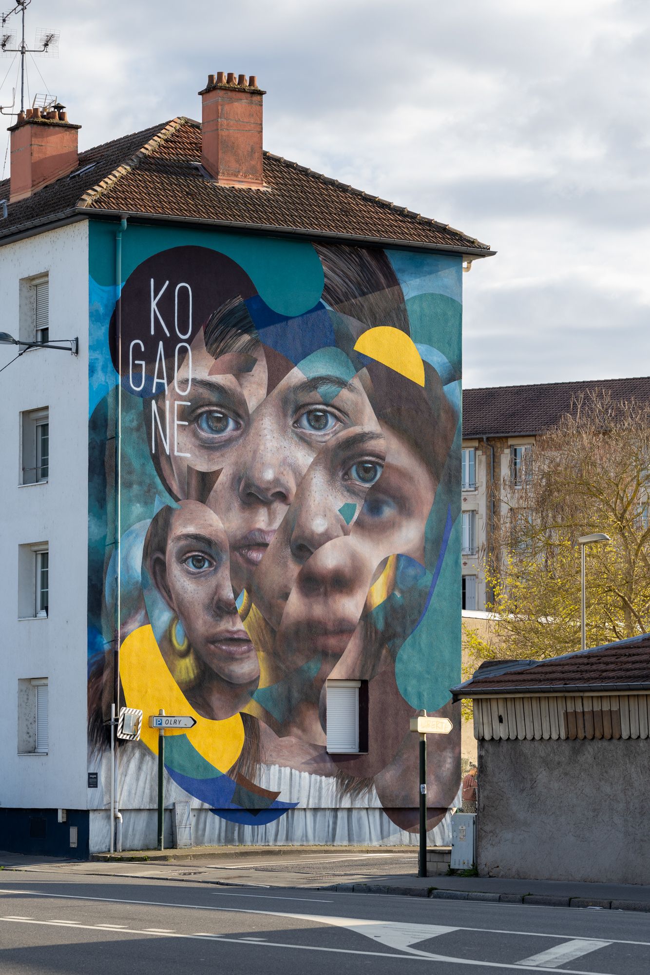Cette création, réalisée dans le cadre du programme de commandes en arts urbains de la région Grand Est, est en partenariat avec Vivest. Elle est la parfaite illustration du travail de Kogaone, qui s’amuse à jouer avec les contrastes de formes, de couleurs et de matières.