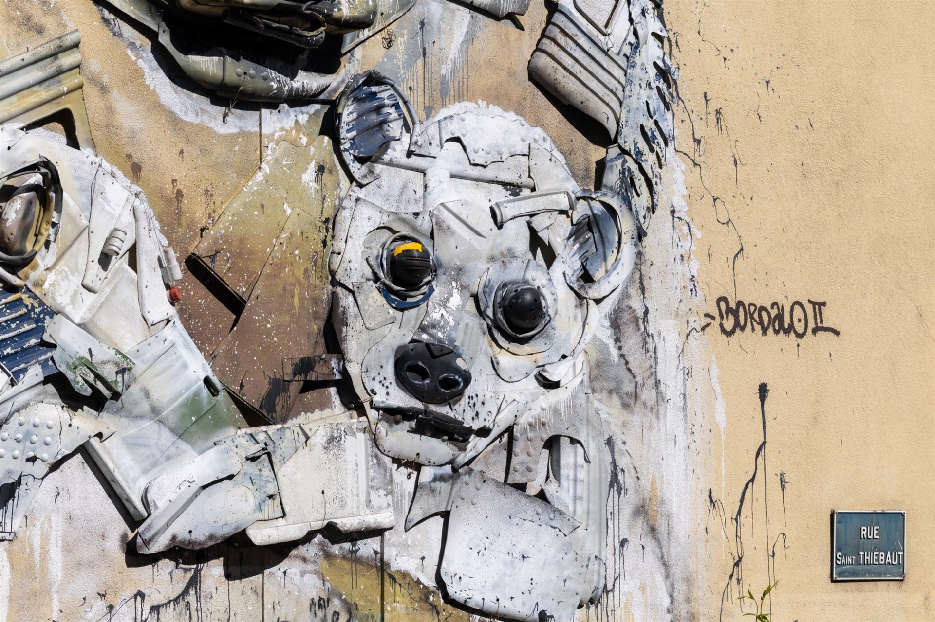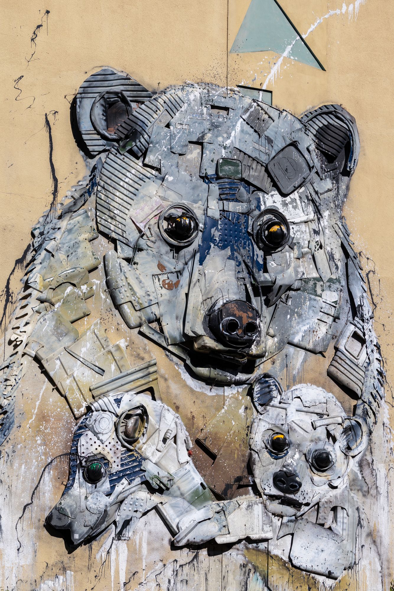 Cette fresque est signée Bordalo II, un artiste portugais qui réalise dans le monde entier des animaux géants en recyclant des déchets pour dénoncer les ravages de la société de consommation sur la nature.