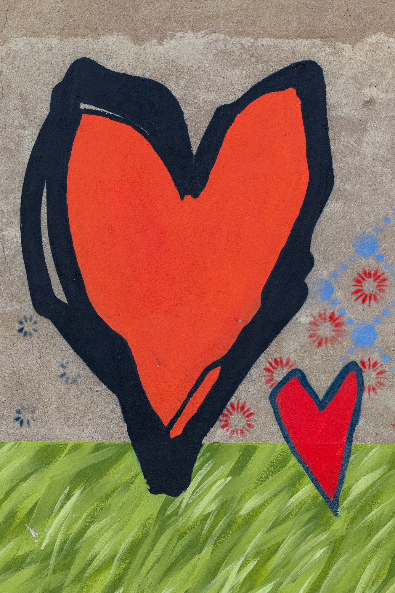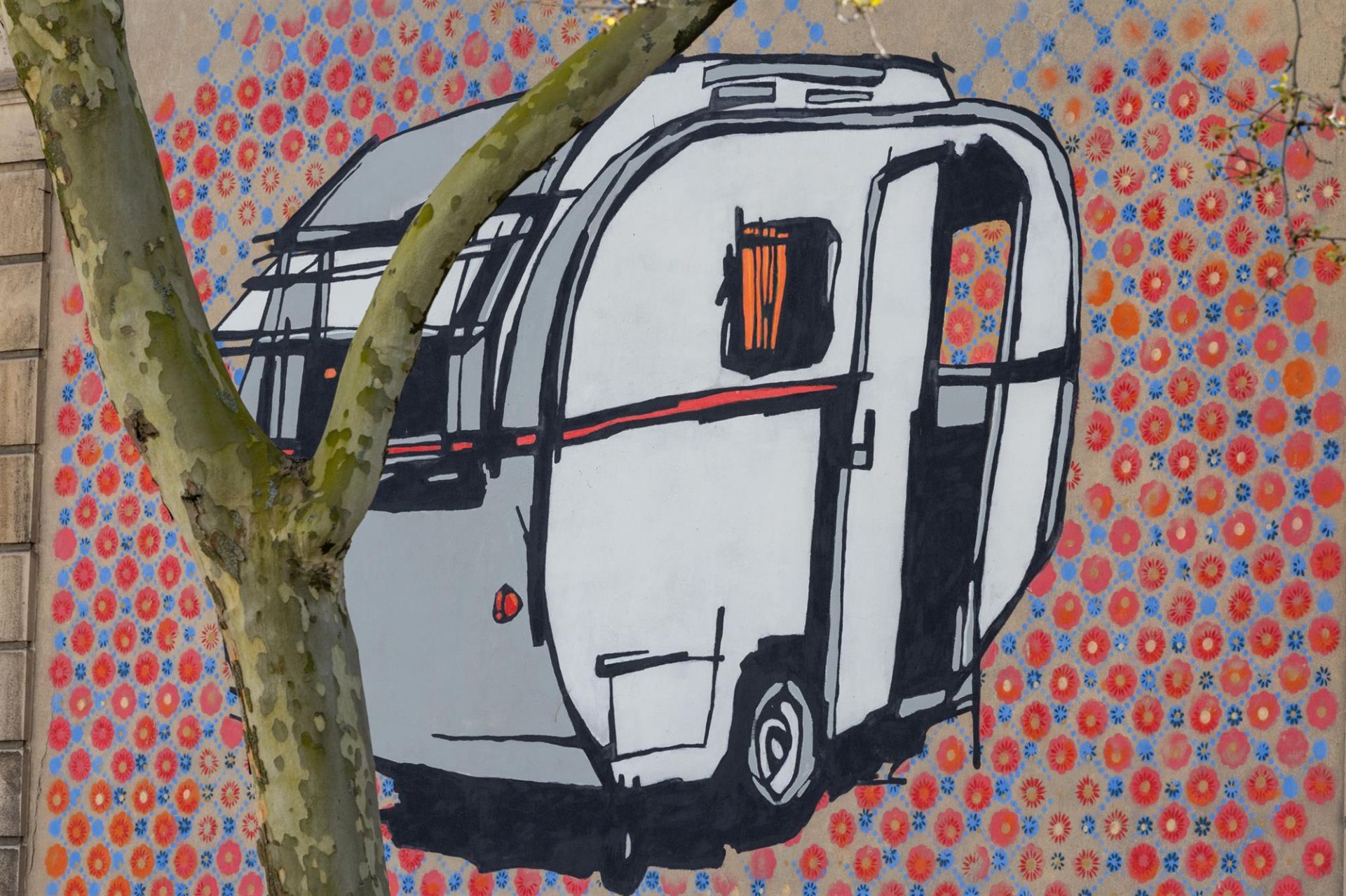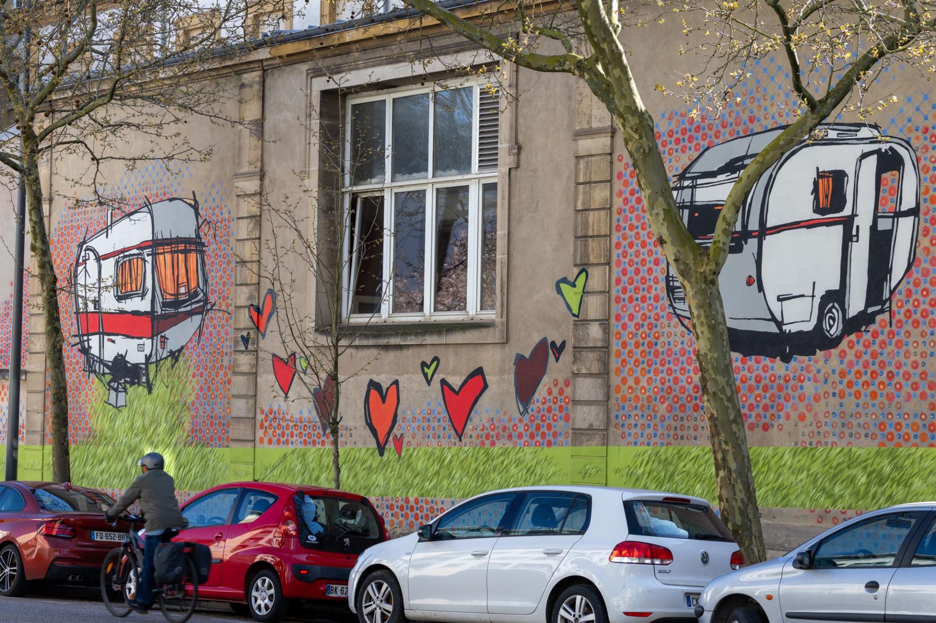 Sur les murs de l’hôpital central, Franc Volo, artiste mythique de la scène alternative nancéienne transporte ses caravanes rêveuses et cœurs poétiques avec une peinture acidulée et intrigante.