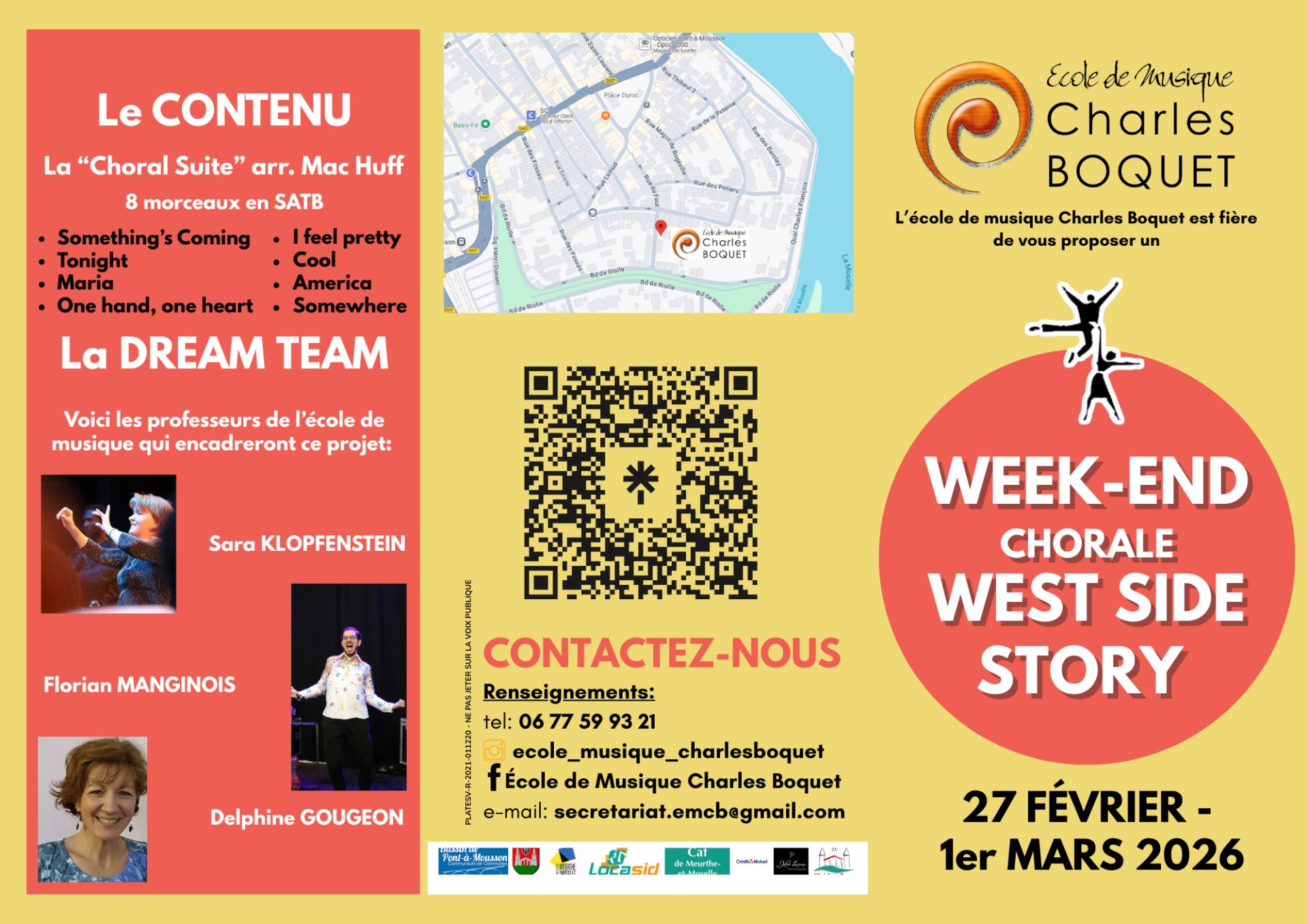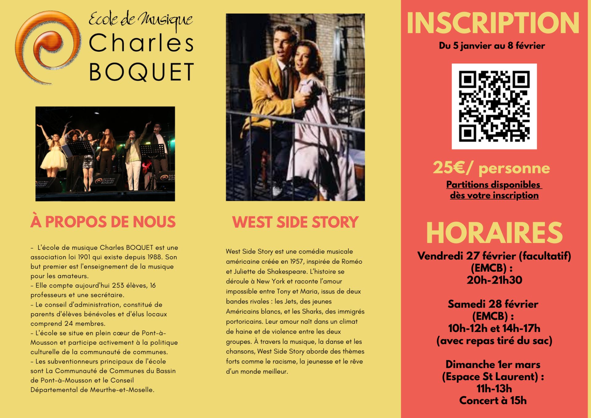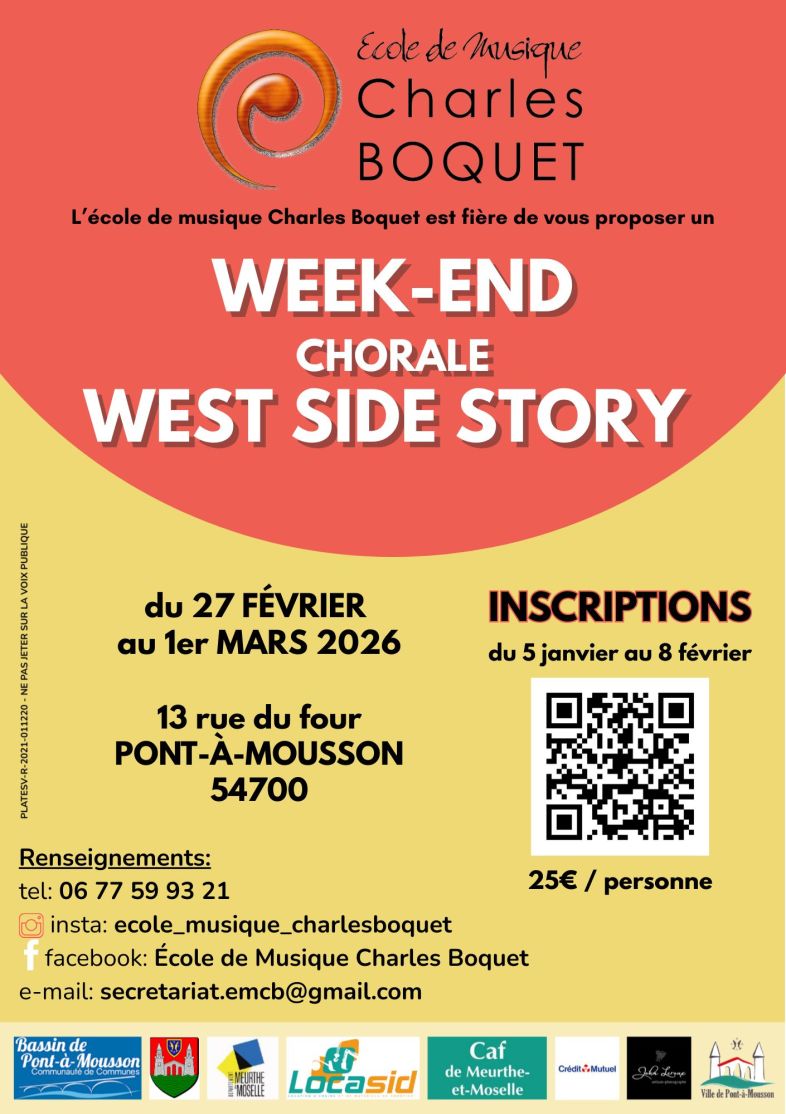 L'école de Musique Charles Boquet est fière de vous présenter un week-end chorale West Side Story, du 27 février au 1er mars ! 8 morceaux, 3 professeurs et une expérience insolite à tester ! Inscriptions du 5 janvier au 8 février via le QR code