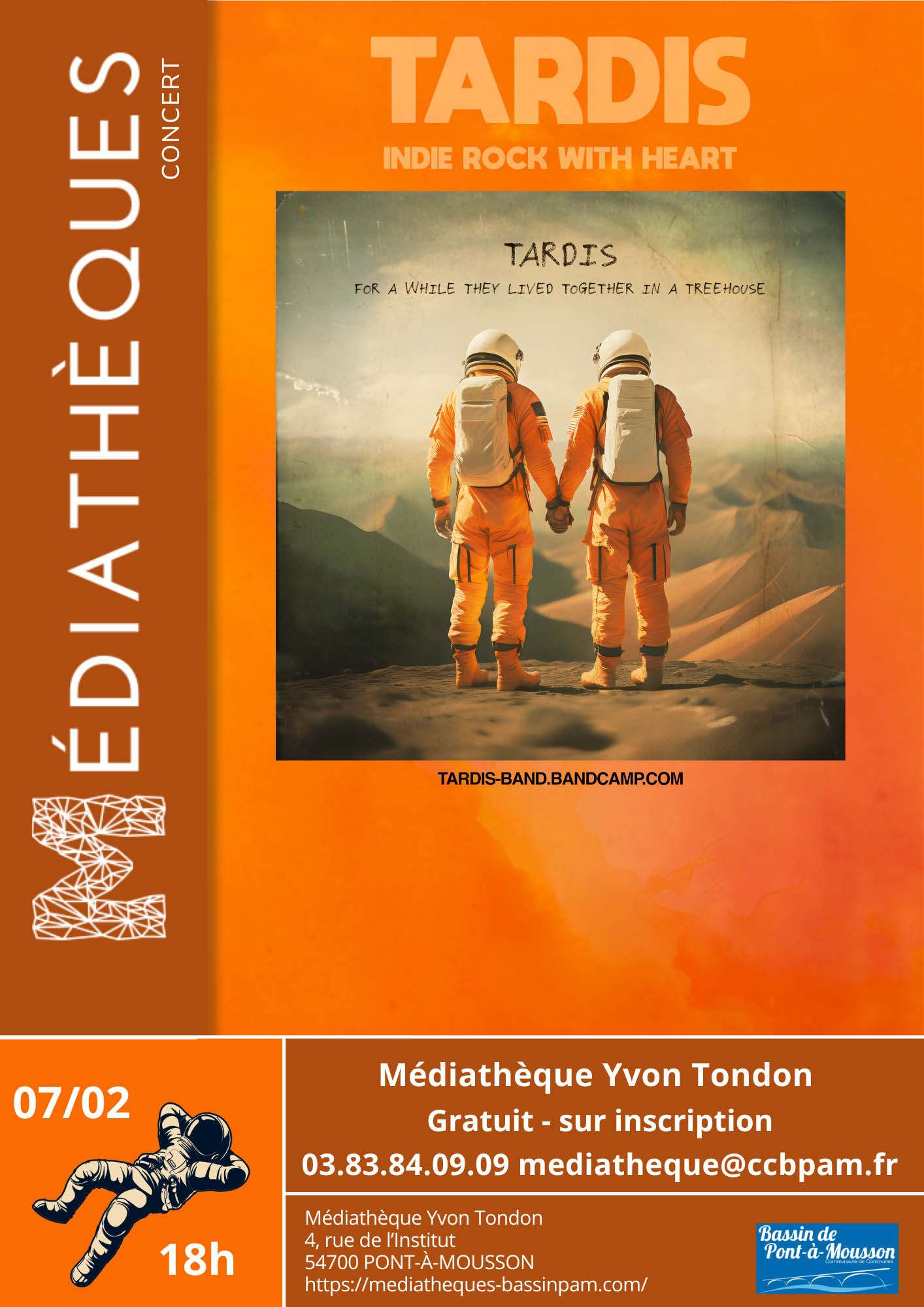Tardis c'est un quatuor nancéien délivrant depuis maintenant 10 ans un rock indé qu'ils décrivent eux même comme "si les Pixies était mené par Graham Coxon des Blur". Pour ce concert le groupe proposera un set acoustique de leur composition issue de leur trois albums. Vous pouvez des maintenant découvrir les disques dans les bacs de la médiathèque en CD et vinyle.