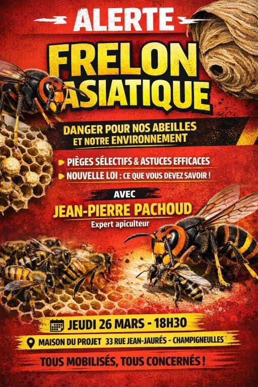 ALERTE DANGER: Le frelon asiatique progresse et menace nos abeilles, notre biodiversité et notre sécurité. Jean-Pierre PACHOUD, apiculteur et spécialiste reconnu de la lutte contre le frelon asiatique, expliquera comment fabriquer un piège sélectif efficace, même sans budget, et présentera la nouvelle loi (décret d'application du 31/12/2025) sur la destruction des nids.Cette rencontre est participative : aucune commune ne peut agir seule. La mobilisation citoyenne est indispensable. Randonneurs, jardiniers, pêcheurs, chasseurs… nous sommes tous concernés. Jeudi 26 mars – 18h30 Maison du Projet, 33 rue Jean-Jaurès Champigneulles