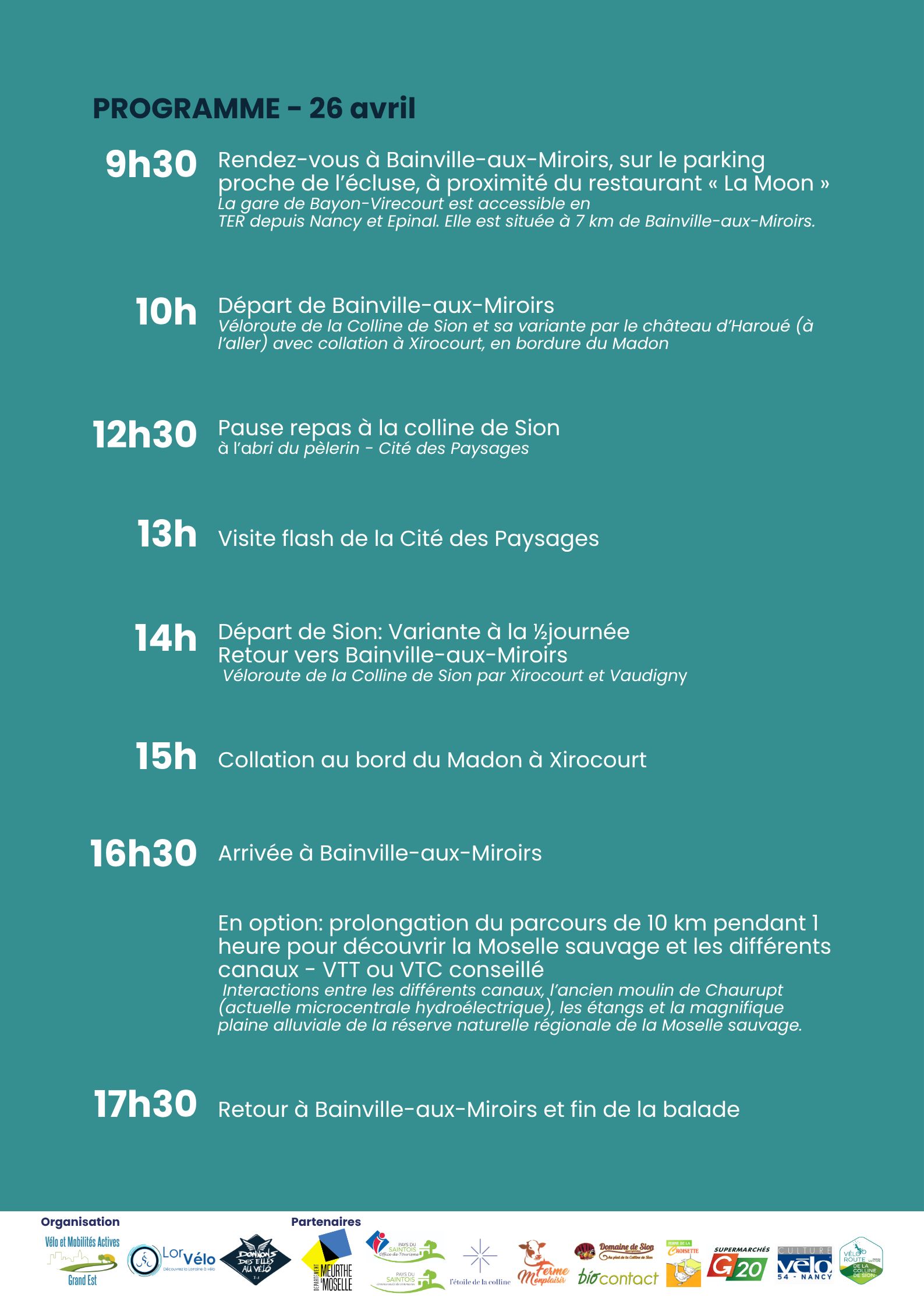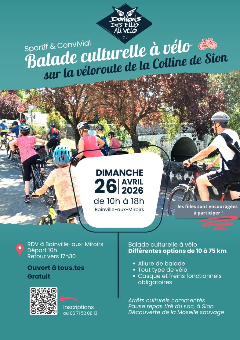 Balade culturelle à vélo le dimanche 26 avril au départ de Bainville-aux-Miroirs de 10h à 17h pour (re-)découvrir la Véloroute de la Colline de Sion et son patrimoine. Repas tiré du sac à prévoir par les participants, goûter et café offerts par l'organisation, à base de produits du coin. Différentes options plus ou moins longue sont possibles, détaillées dans le formulaire d'inscription.