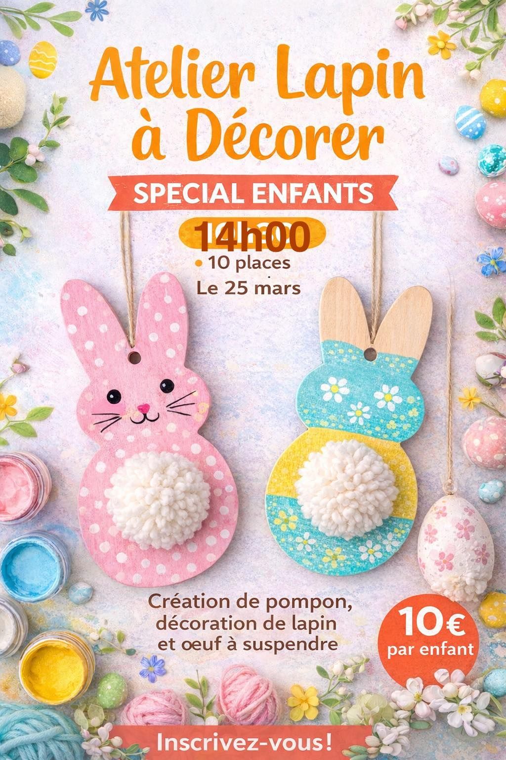 Atelier Lapin à décorer - spécial enfants Création de pompon, décoration de lapin et oeuf à suspendre Sur inscription Attention ! Changement d'horaire : initialement prévu à 10h30, l'animation est à 14h.