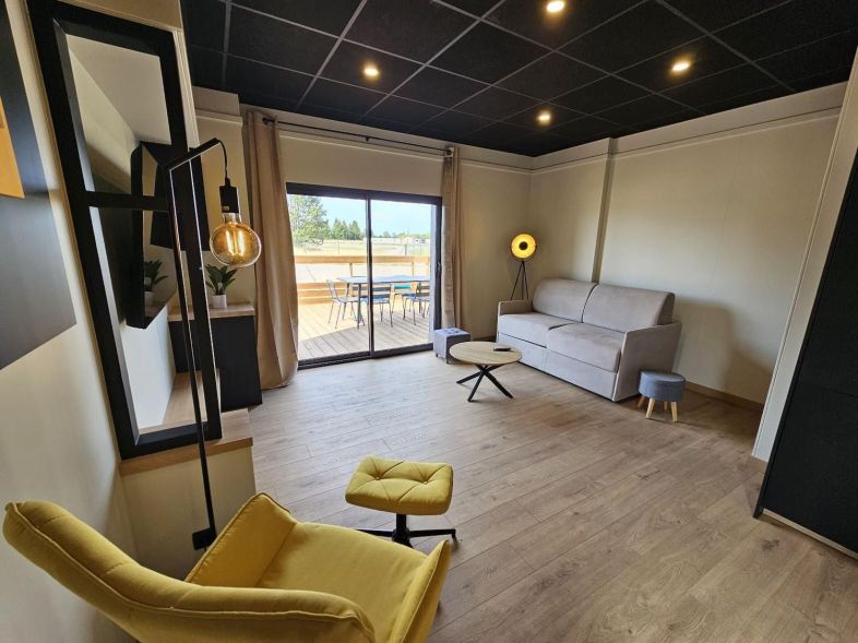 Ce gîte pour 6 personnes vous accueille dans ses 2 chambres luxueuses avec lits 160, chacune dotée d'une salle de bain privative, 1 salon avec canapé lit confortable, 1 WC séparé à l'étage et 2 terrasses dont une à l'étage offrant une vue imprenable sur la piste de l'aérodrome.