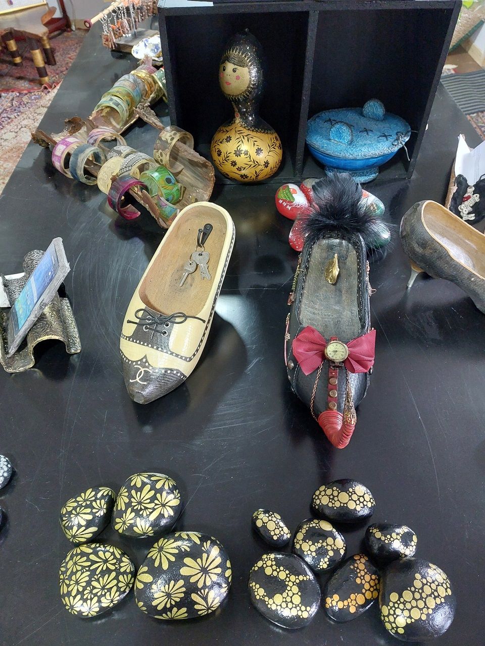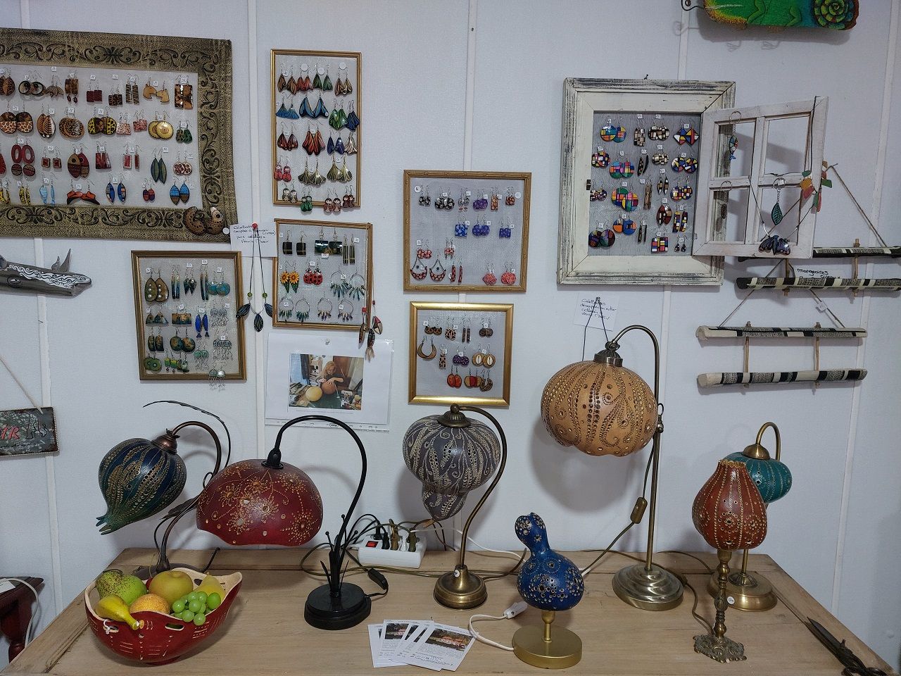 Venez découvrir le travail de Jacqueline Vanmerris dans sa salle d'exposition! Une artiste qui possède plusieurs cordes à son arc: lampes en calebasse, rondins de bois peints, nichoirs en calebasse, bijoux en calebasse, galets peints, bâtons de marche peints... Réalisations sur demande ou réparations d'objets. Salle d'exposition permanente ouverte tous les jours ( sauf en cas de Marchés artisans). Horaires: 11H/12H - 15H30/19H. Vous pouvez appeler avant si vous le désirez ou envoyer un mail.