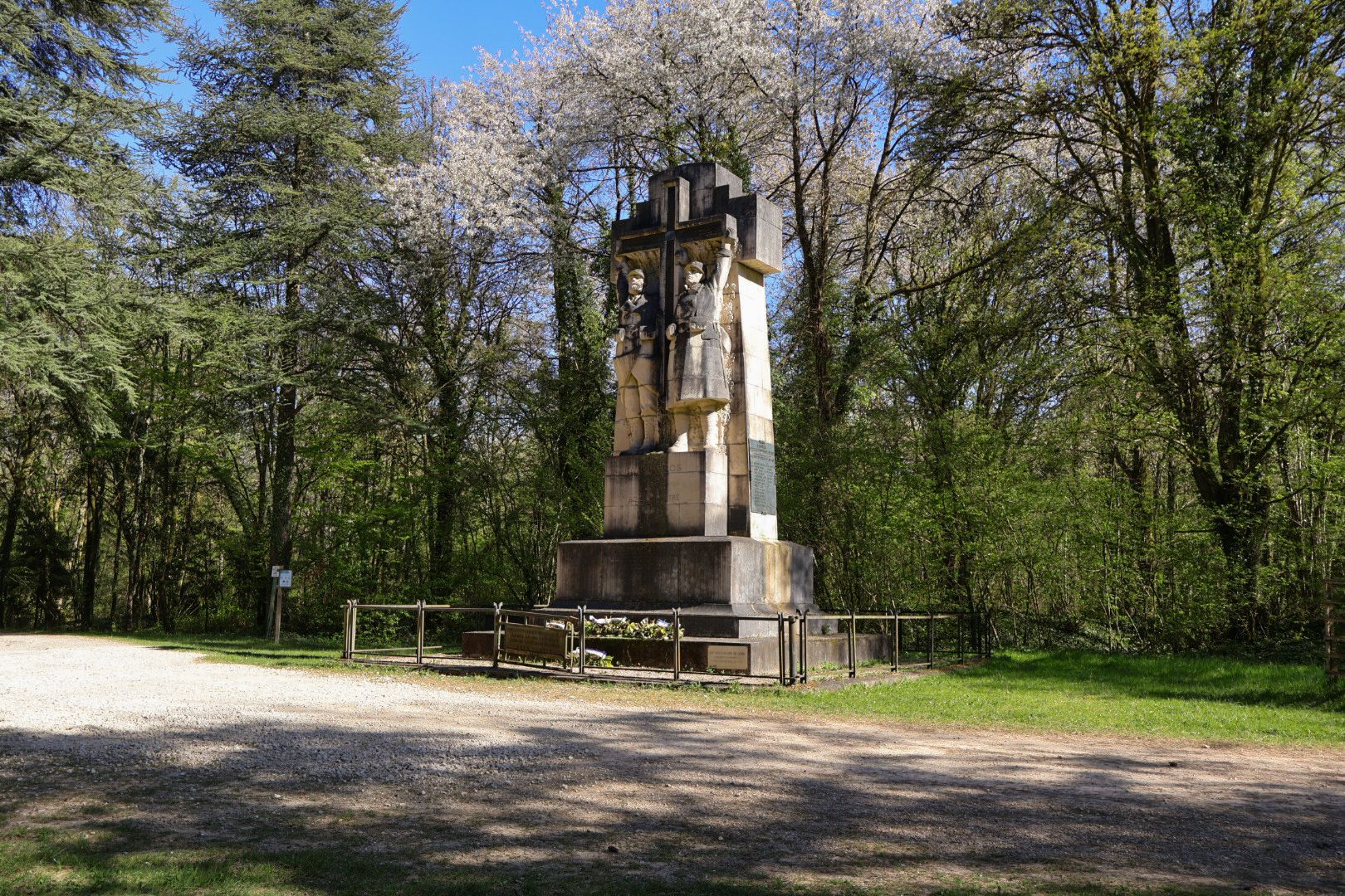 Monument sculpté par Emile Just Bachelet en 1923 , représentant une croix de pierre soutenu par deux soldats français.