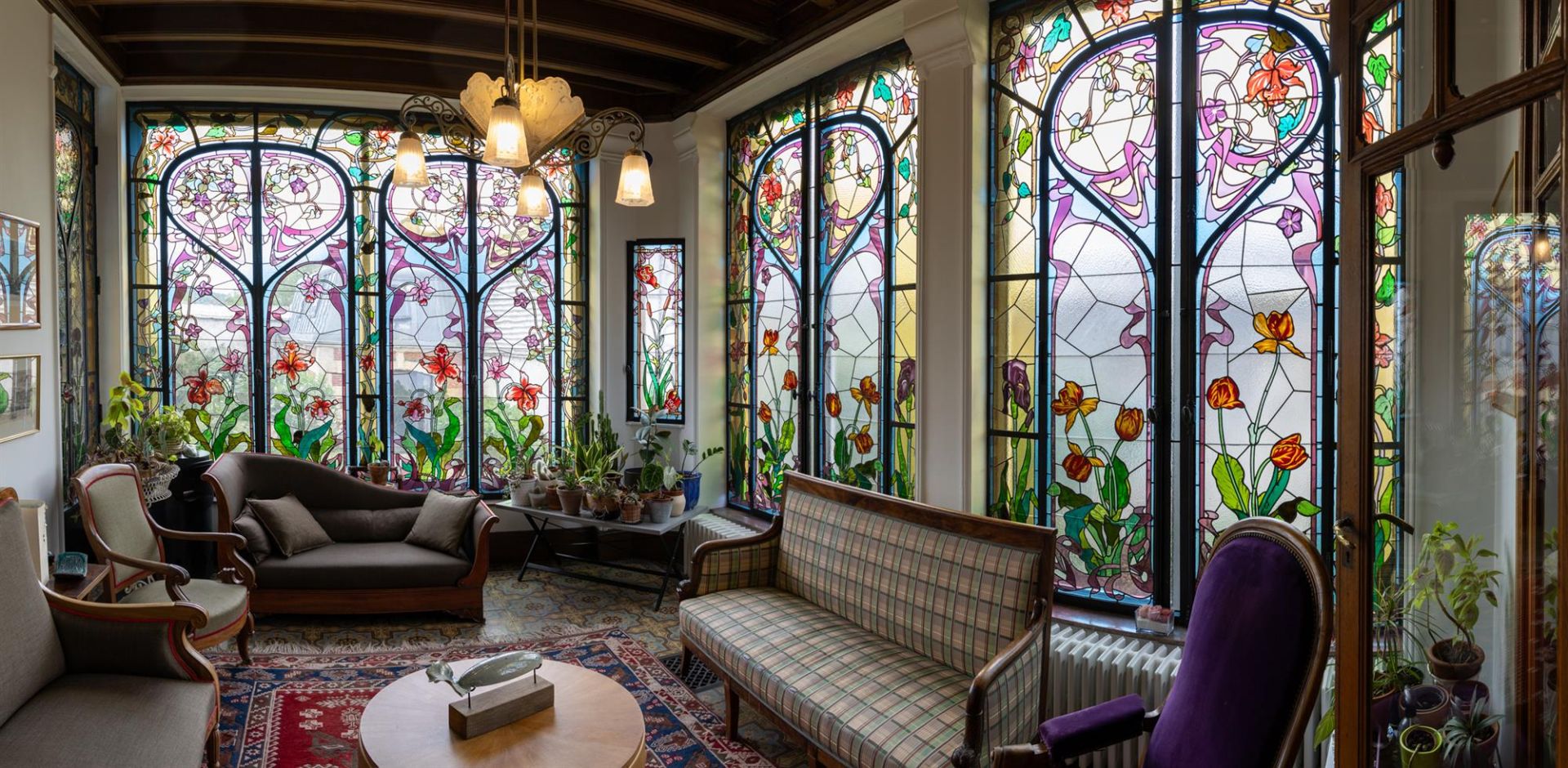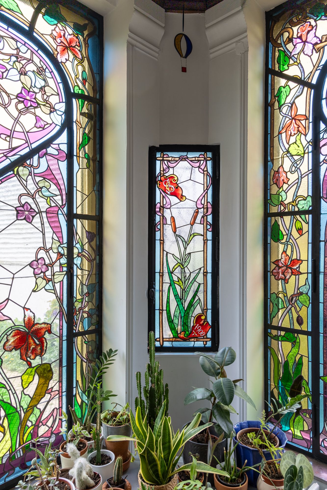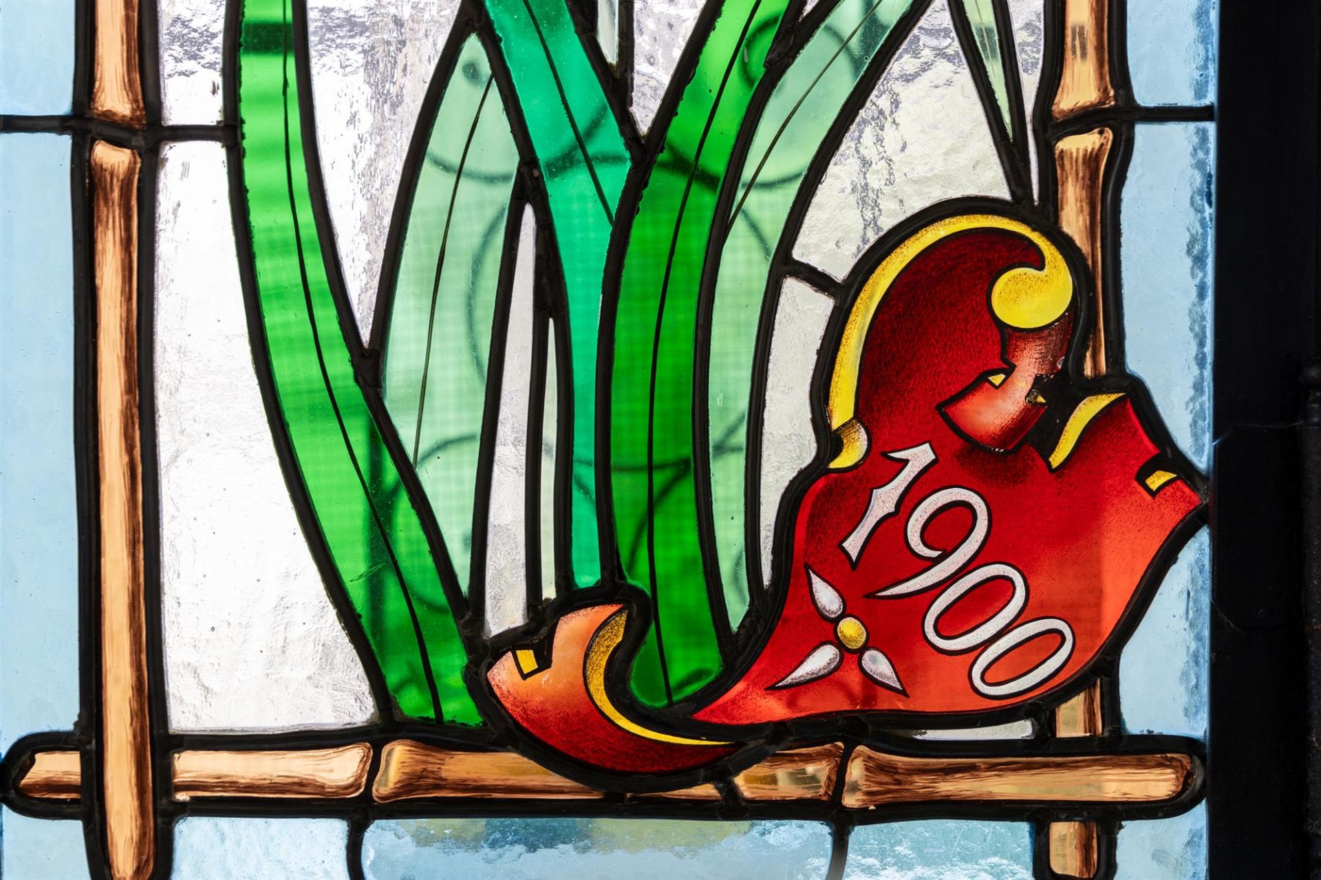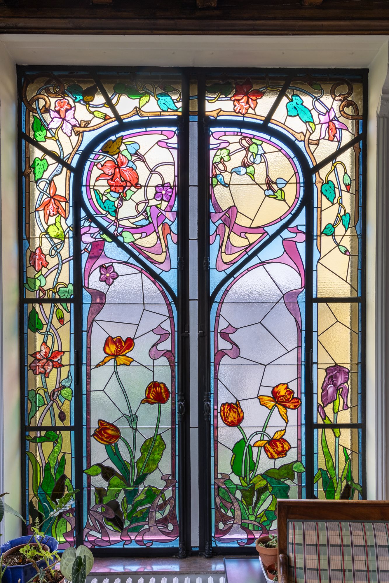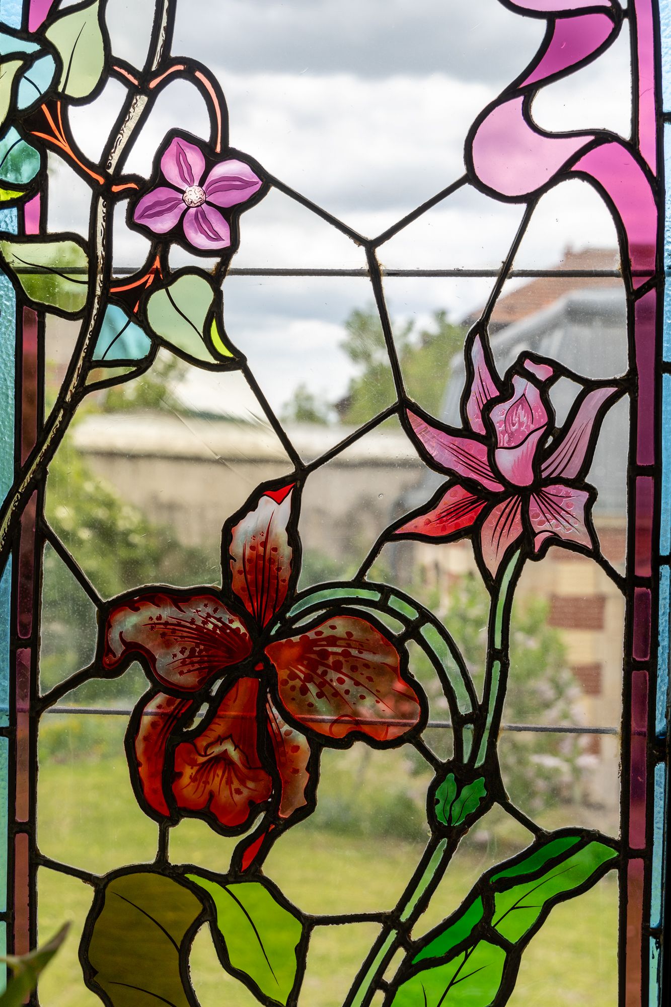 La verrière du peintre-verrier Antoine BERTIN est datée de 1900. En verre simple et en verre gravé à l’acide sertis au plomb, au décor de lys, orchidées, capucines, clématites, tulipes et iris, dans les tons de vert, violet, bleu et jaune, cet ensemble est considéré comme un ouvrage précurseur de l’art du vitrail de l’École de Nancy.