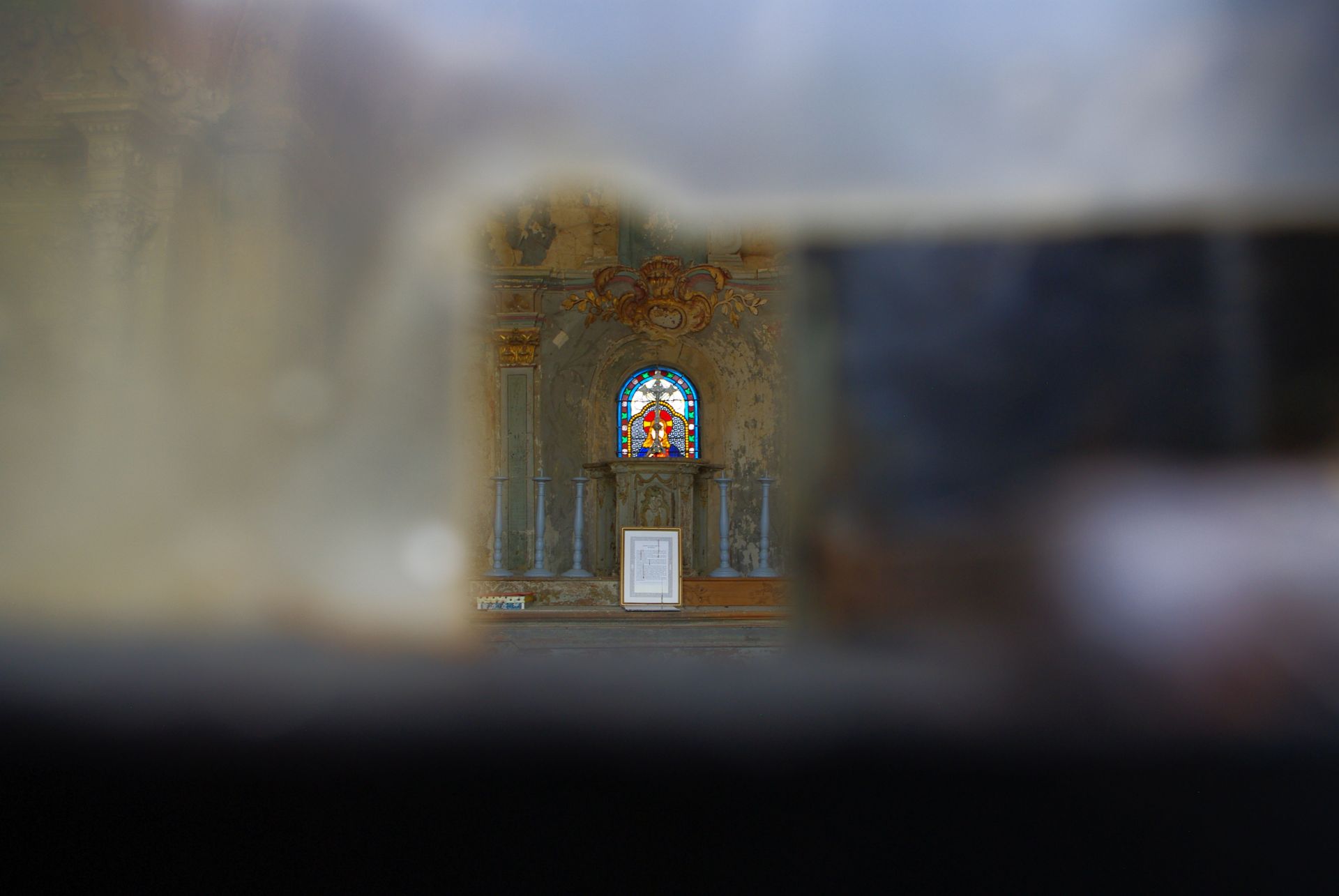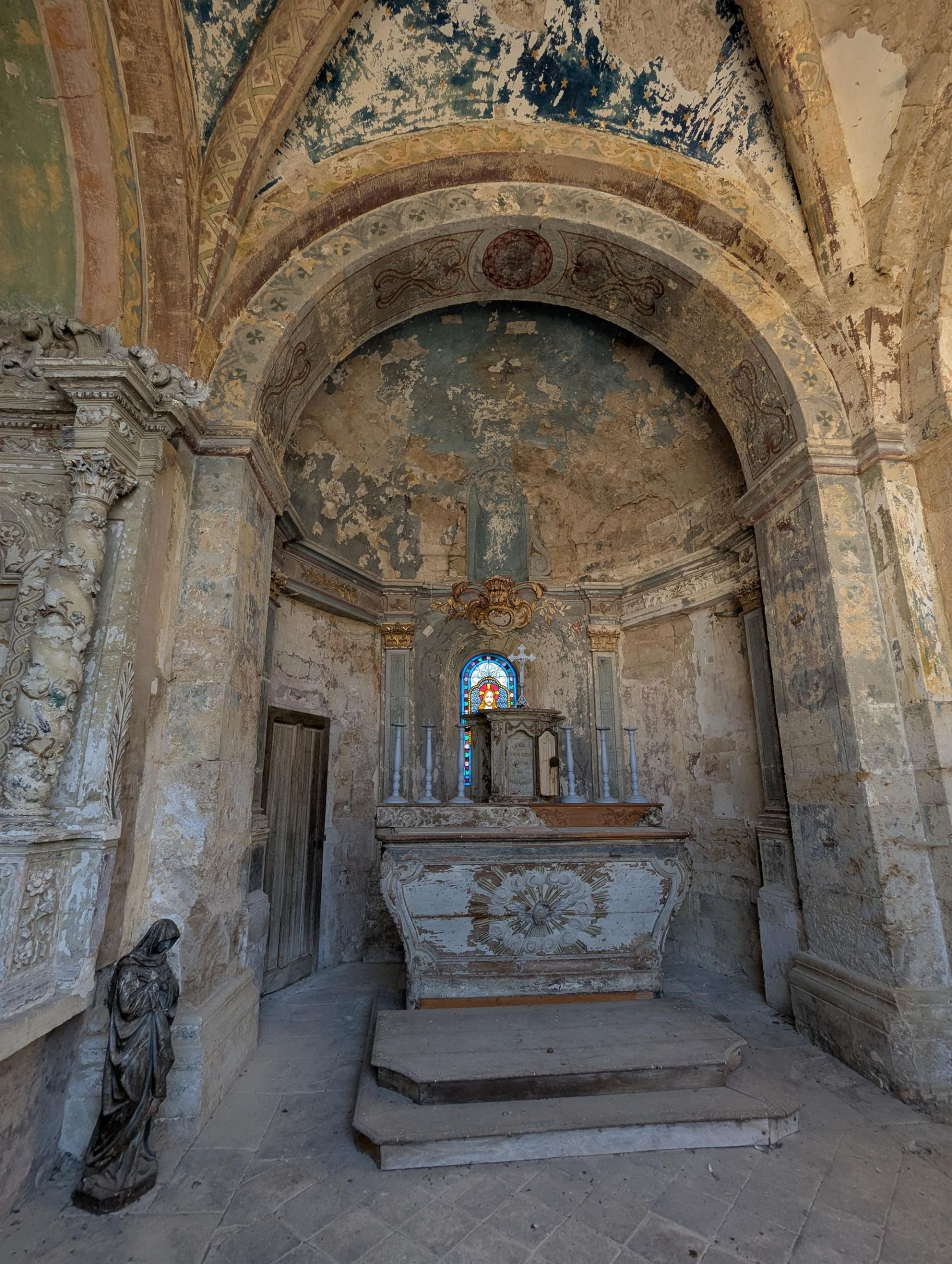 Les retables, déplacés depuis la nef, présentent de belles colonnes torses décorées de grappes de raisin et de feuilles de vigne. Le maître-autel, en bois peint et doré, complète l’ensemble.