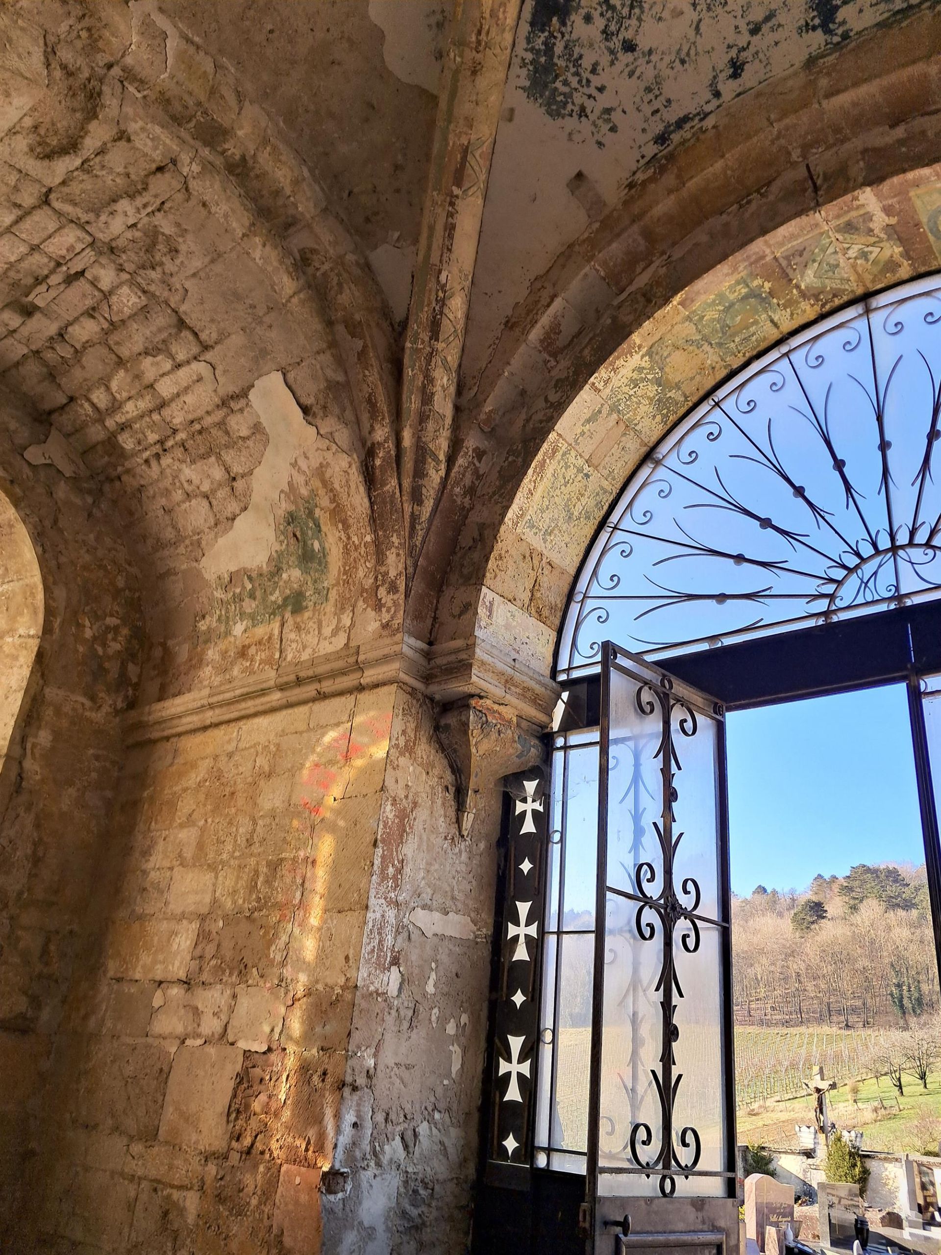 À l’extérieur, la tour romane, percée d’ouvertures géminées, fut surélevée au Moyen Âge pour servir de refuge. On y accède encore aujourd’hui… par une échelle.