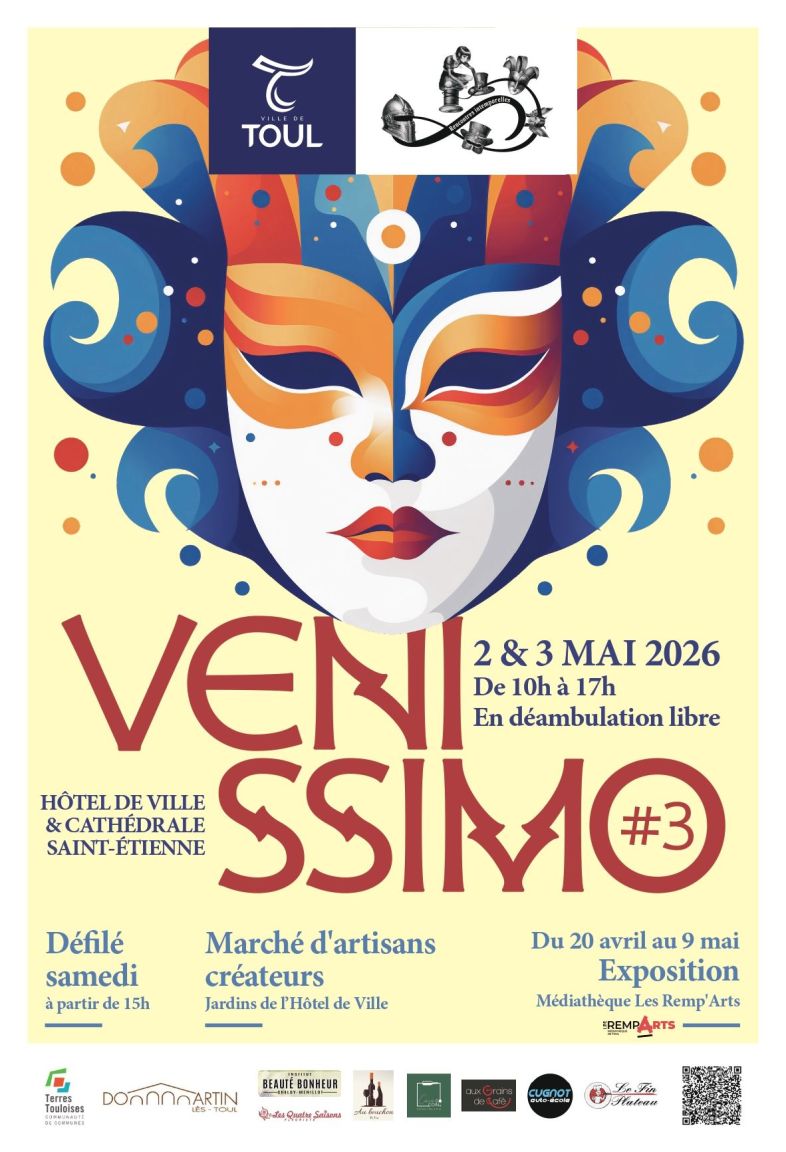 For the 3rd annual Venetian Carnival in Toul (54200), come and discover Venetian costumes created by passionate artisans! Around Toul Cathedral and in the town hall gardens, costumed participants will stroll freely among the public. A parade will take place in the town on Saturday starting at 15 pm (departing in front of the cathedral). A group photo is planned for Sunday at noon in the gardens. You can also enjoy a dance performance by the Art Scène Danse company at 11 am and stilt walkers from 13:30 pm on Sunday. Exhibitors and a face painter will also be there! The Toul media library is hosting an exhibition from April 20th to May 9nd inclusive, featuring photos from the previous year's event.