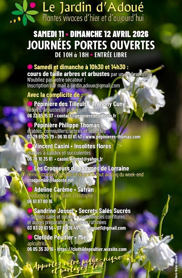 Dear gardeners and other plant and garden enthusiasts, During the spring open days on Saturday, April 11th and Sunday, April 12th, 2026, the Jardin d'Adoué will host: Anthony Cuny, Pépinière des Tilleuls (Linden Tree Nursery), roses, shrubs, and collector's plants; Philippe Thomas: maples, dogwoods, trees, and shrubs; Vincent Casini - Insolites Florès: caudex plants and succulents; Adeline Carême, saffron; Sandrine Josset, Secrets Salés et Sucrés (Savory and Sweet Secrets), jams and other refined culinary preparations; Clotilde Peultier, honey; and the "Croqueurs de pommes" (Apple Lovers) association will offer pruning and grafting demonstrations throughout the weekend. The Jardin d'Adoué will also offer tree and shrub pruning classes taught by a professional (registration by email at jardin.adoue@gmail.com). Remember to bring your picnic and share it with other gardeners – the atmosphere will be friendly and welcoming! You're sure to hear stories about plants and meet other wonderful people! Free entry