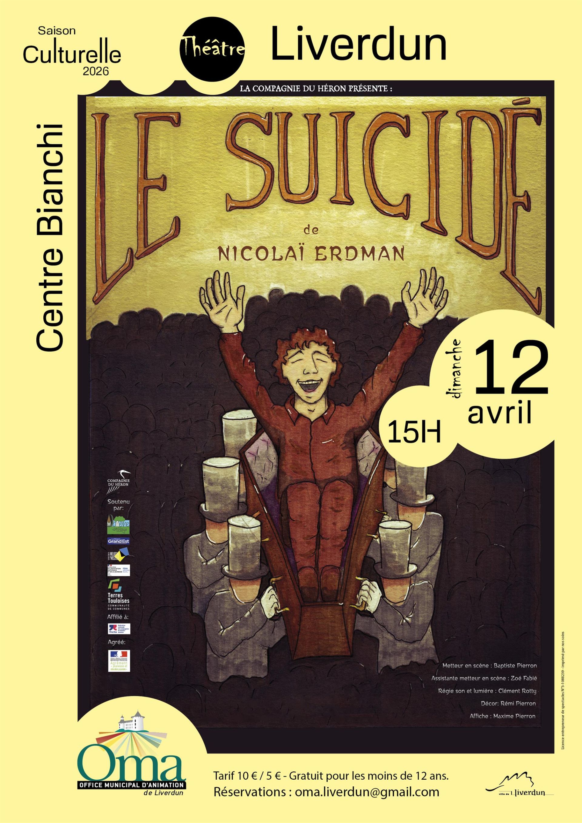 By the Compagnie du Héron, based on the book by Nikolai Erdman (1916), directed by Baptiste Pierron. An absurd social comedy. Semione is unemployed. When a quarrel erupts in his marriage, he makes a suicide threat. A half-hearted one, without even really believing it. But everyone convinces him otherwise. Semione must die, for the sake of others… This comedy gives a voice to those who don't produce. In a society that demands productivity, existing without a purpose becomes a transgression. The play pushes this principle to the absurd: a worthless man is the winning ticket in a desperate social lottery. Despite everything, Semione, who dreams of being a musician, says no to all of this and yes to life, even the smallest life. The Compagnie du Héron brilliantly and humorously demonstrates in "The Suicide" that there is only one thing that cannot be taken away: the right to belong to oneself. "Never speak on behalf of those who suffer if you prevent them from speaking for themselves." Sunday, April 12 at 15 p.m. at the Bianchi Center (2 Allée de Bretagne). Tickets: €10 / €5 (job seekers, students, ages 12-16, people with reduced mobility and their companions) – free for children under 12 – reservations: oma.liverdun@gmail.com