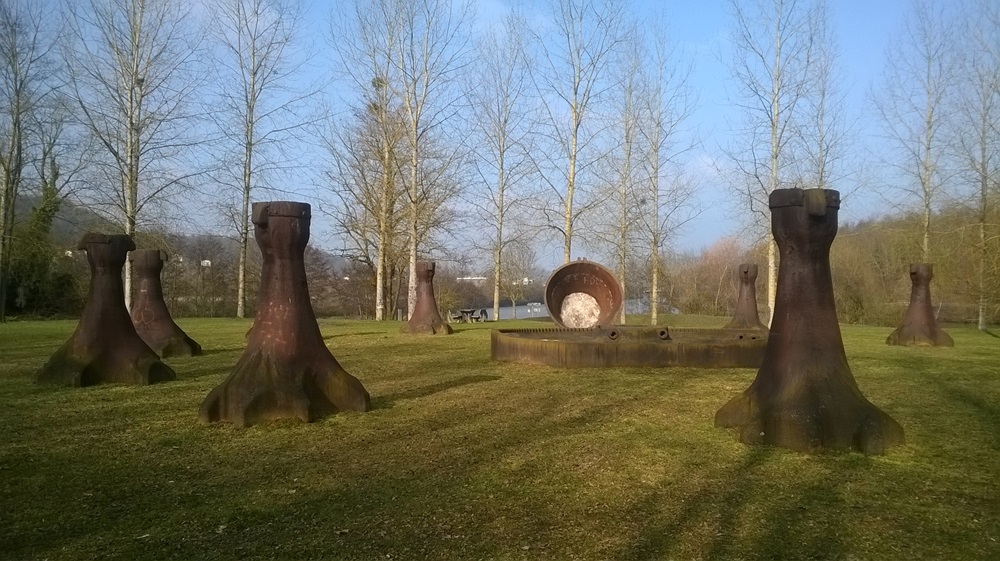Entre Frouard et Custines, sur la rive droite de la Moselle, une étonnante œuvre d’art est érigée sur le site dit de « la gueule d’enfer ». 12 blocs métalliques appelés « mères de coulées », récupérés des aciéries de Pompey, sont disposés en cadran solaire. De retour sur la rive gauche, vous apercevrez des blocs verticaux qui ont été dressés et alignés tels des menhirs. Une belle façon de détourner les vestiges de la sidérurgie et de les valoriser !