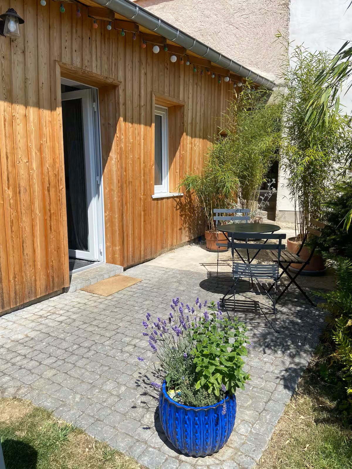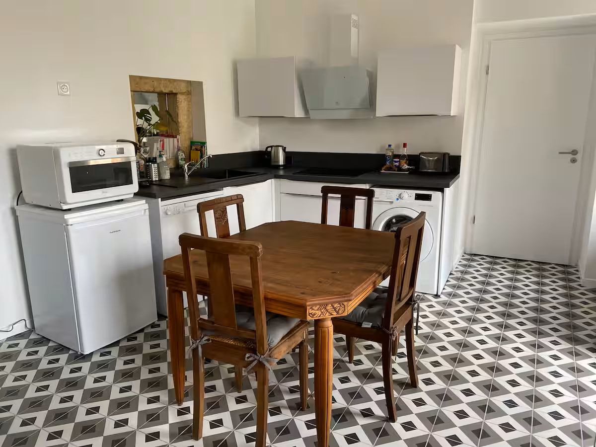 A proximité propriétaire, mitoyen propriétaire, jardin indépendant, salon de jardin, plain pied, salle de bain privée, cuisine, chauffage, télévision, four, lave linge privatif, lave vaisselle, draps et linge compris, micro-ondes, wifi