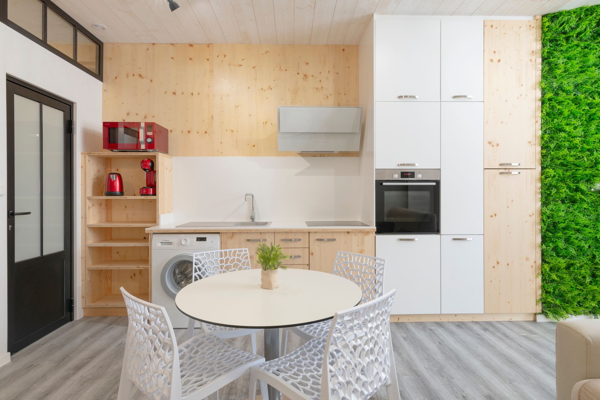 - Une cuisine équipée avec notamment , bouilloire électrique, four, four à micro-ondes, grille-pain, lave-vaisselle, plaques de cuisson...